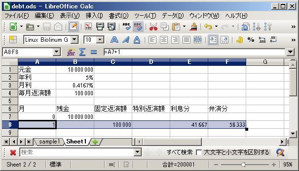 手計算では大変なものが、Calcなら、同じ条件で完済するまでの計算が瞬時にできました。