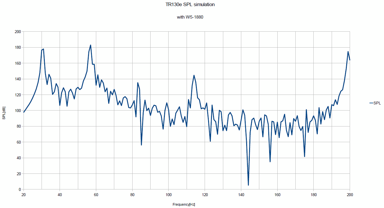 シミュレーション結果は下図の通りです。縦軸のSPLの値は、加振力を一定とし、変位速度の加重和から空気の動圧を求め、それをデシベル値に変換しましたものなので、絶対値には意味はありません。