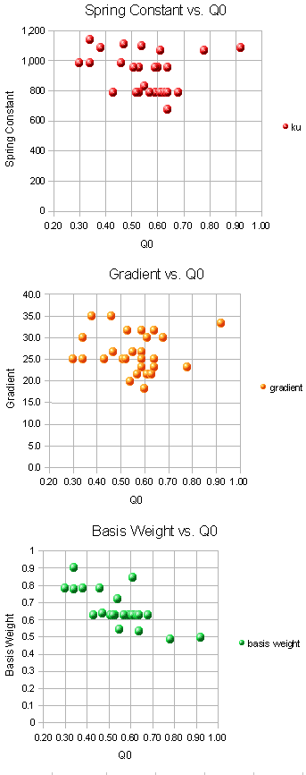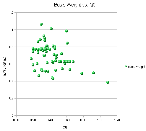次に、Q0とm0をa0で割った値(製紙工業の用語では坪量に相当)[kg/m2]との関係をプロットしてみました。
