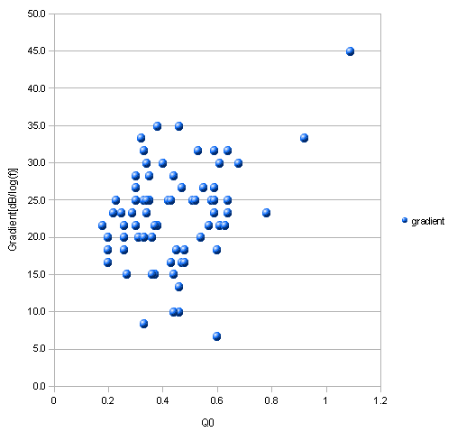 これも、Q0が小さいほど共振の度合いが小さいので、低域のレベル落ちが大きく、全体として右下がりの傾向を予測していましたが、グラフを見るとそういう 訳でもないようです。これも、右上がり、右下がりのどちらにも見え、相関は明確ではありません。