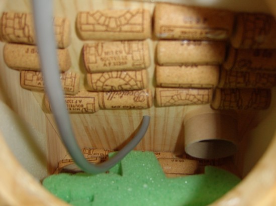 先ず最初は、空気室に入れることにより、反響を散らそうと思い、暫く貯めておいたコルクを使うことにした。これらのコルクは、カッターナイフで縦割りに し、空気室の内壁を波型にするのに使用する。綺麗な波型ではなく、適度に乱雑に並べたほうが良い。