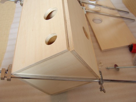は、ボンドで側板に接着する。今回は、手間を惜しみ、ビスを使って圧着した。その後、ビスは全て抜いてしまう。時間が経過して、ビスが緩むと修正のしよう