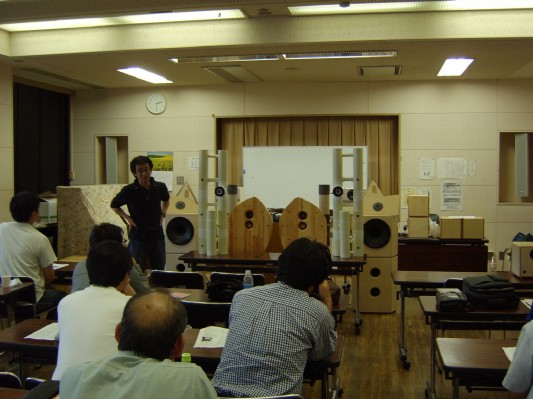(木)勤労感謝の日 スピーカー再生技術の新しいカタチを目指し、26名もの人々が東京文京区にあるアカデミー湯島に集結しました。 アカデミー湯島は、文京区民のための生涯学習施設として設けられたものです。このオフ会は、目的に相応しい学習会として開かれたものです。 定員は56名(+4名分の椅子)です。定員の約半分の人員による会でしたが、会場がゆったりと使えたので、移動して近くで観察したり、いろいろな場 所から聴いたりして、実際に肌で感じる観察が出来ました。 |