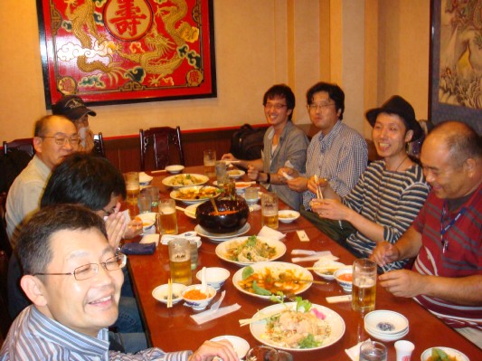 オフ会が終わっても、来場された方々の熱気が冷めずあちこちで話し込んだりして、中々解散出来ませんでした。 懇親会は、18:30からの予定だったが、撤収が終わって始められたのは19時近くなってからでした。この写真を撮影したのは、18時50分頃ですが、まだ、松さんは到着していません。 オフ会の熱気覚めやらぬところで、会話があちこちで盛り上がりました。手前側で盛り上がったのは、某社のバックロード用フルレンジユニットの話題でした。 この話題は、大山さんのメルマガのタネにもなりました。 ここからまた新しい発見が出来、次の研究の種が見付かれば、研究会オフ会の第1回目としては大成功だと思います。 |