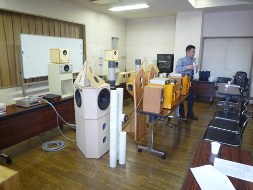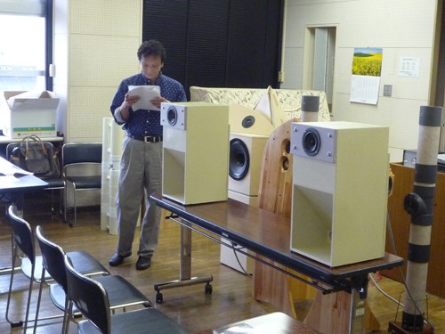 室の標準型MCAP-CRですが、標準設計とは異り、内部のダクトの共振周波数を下げてバランスを変えています(薄い色の大型システム)。 このような設計により、スピーカーシステムより後方にも音場が拡がりました。また、12インチの大型システムにもかかわらず、点音源のような音場を実現してい ます。参加者は音の良さに驚いていました。 詳細は、こちらをとこちら ご参照ください。 本人のコメント バンビーノはN.D.R.システムの形態をとっていますが、音の感じは本来のN.D.R.とはかなり違っていました(;^▽^;) 音場がかなり狭いです ね。予想はしていたことですが、大口径フルレンジユニットの指向性の狭さも原因のようです。3方向(120度間隔)では不十分な感じです。一方、MCAP −CR型エンクロージャの効果は高かったと思います。ユニットのエフゼロは70Hzと高いのですが、MCAP−CRによって40Hzあたりまでは不足感な く再生できたように思います。あと、大音量のときにエンクロージャ内部の濁った音が広い振動版を通して外に漏れてしまうのがよくわかりました。家で小音量 で聴いていたときには気づきませんでした。これも大口径ユニットの新たな問題点ですね。まだまだ研究が必要です。ご試聴くださったみなさん、どうもありが とうございました! |