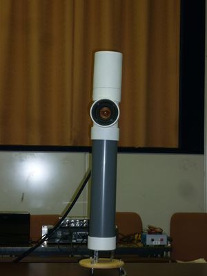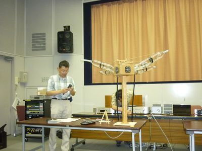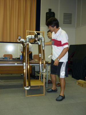 自分は、ご挨拶、進行の説明と、時間調整を兼ねて最初に登場しました。 紹介したのは、ペットボトルを副空気室に利用した標準MCAP-CR型の作品です。3月にタモリ倶楽部で紹介されたものなので、ご存知の方もいらっしゃったと思います。 この作品のポイントは、音の良し悪しは置いておいて、MCAP-CR型の構造が分かりやすいことです。副空気室やダクトが外から一目で分かります。タモリ倶楽部でも使用したオルガン作品やグノーのミサ曲といったマイナーなソースを鳴らしました。 外観の印象とは違い、低音から高音まで意外にスムーズに再生できました。この時点では入場者が少なかったのが残念でした。一般入場者に午前スタートは少し無理があるかもしれません。 |