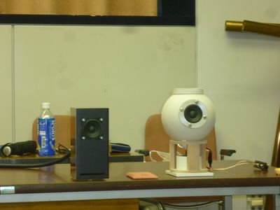 ロットルを設け、そこから先を共鳴管にするというもの。世界初公開です。全ては1本に繋がっていますが、スロットル(パイプ入り口の絞り)の効果によって、パイプが分割されて別々の動作をします。 また、耳につきやすい周波数の共鳴を抑えるために、感の太さを途中で絞ったり開いたり、曲げたり、一部には紙のパイプを使ったりと、試作過程で追い込んで います。このため、再生された音はかなりフラットで、しかも40Hz以下までを十分な音圧で再生します。外見と音とのギャップで会場を最も沸かせたシステ ムです。 大沢さんの次の作品は、ポートの切替式MCAP-CR型です。ポートは全面、後面に配置され、ゴム栓をすることで、前面ポート、背面ポートを切り替えることができます。 ポートの切り替えの効果は、会場が広いために、おおきくはならなかったとのことでしたが、私には良くわかりました。また、背面のポートに径違いソケットを 付けたときには音が力強くなるなど非常に興味深いものでした。背面のポートを集合させると任意結合型多自由度バスレフのAICC-CRの音になることも確 かめられました。 大沢さんコメント: 今年も大変すばらしいオフ会に参加させていただきありがとうございました また大変お疲れ様でした。 関係者の皆さんには目立たない雑事を黙々とお手伝いいただきまして、発表者の方ばかりでなく見学、落札者の方までお手伝いいただき感謝です。 自分の発表は持ち時間の勘違いで惨憺たる有様で申し訳ありませんでした。 準備した解説がすべてオミットになりガックリでしたが、音は評価いただきましてありがとうございました 来年また会いましょう。 |
