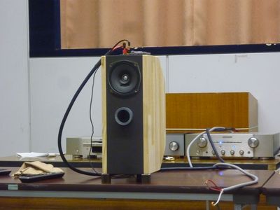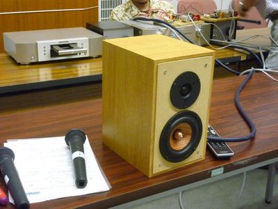 場合に比べて少しざらついた感じに聞こえました。 ネットワークは上手に使えば良い音になるという実演でした。 石田さんコメント: 今回は急遽の参加のため共鳴系を使用したシステムではありませんが、測定をベースにした小型システム例として紹介させて頂きました。 2段のPST回路等で全帯域のフラット化を図りスーパーツイータ程度の高域付加によりシングルコーンの良さを生かしたワイドレンジシステムを狙いました。 広い会場なので、少しオーバードライブでしたが、会場の響きの良さに助けられて何とか無事にデモは終えることができました。 スピーカは聴感による調整も重要ですが、アンプ作り以上に計測による基礎調整が重要だと思います。この例が少しでも皆さんの参考になればと思います。 |